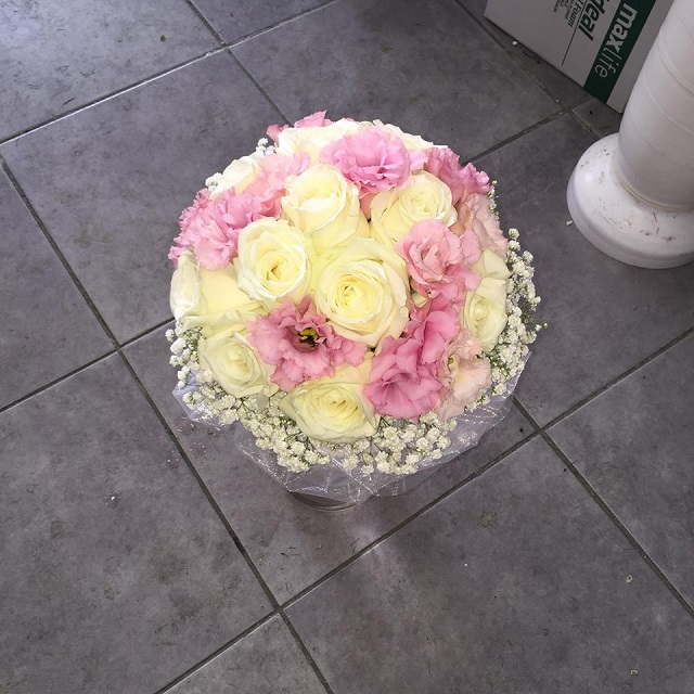 זר כלה מעוצב, מרשים ויוקרתי בשילוב ורדים לבנים, ורודים וירק.