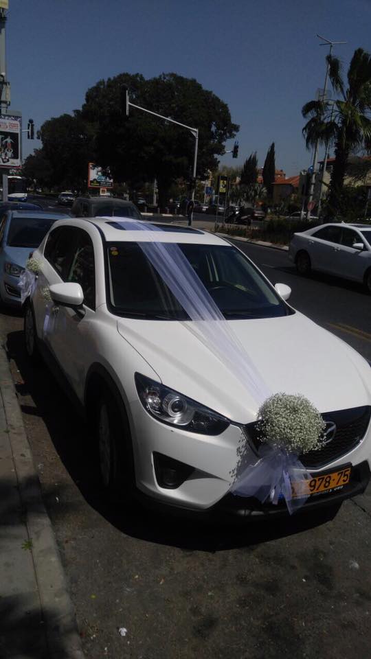 קישוט לרכב חתן כלה אשר משלב טולים מבד ופרחי גיבסנית לבנה, הקישוט ניתן להתאמה במגוון צבעים בהתאם לצבע הרכב.